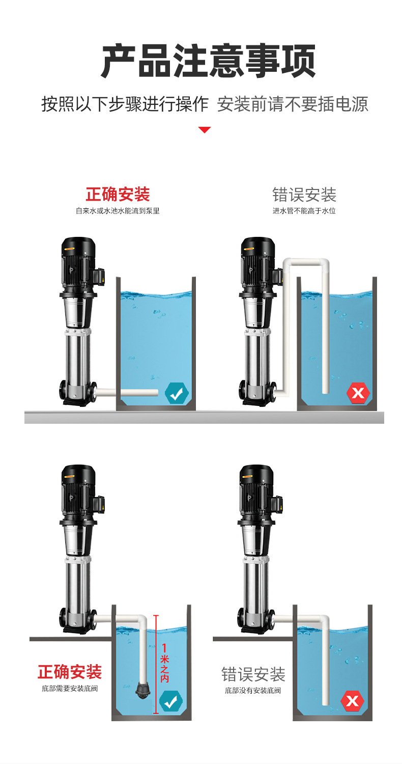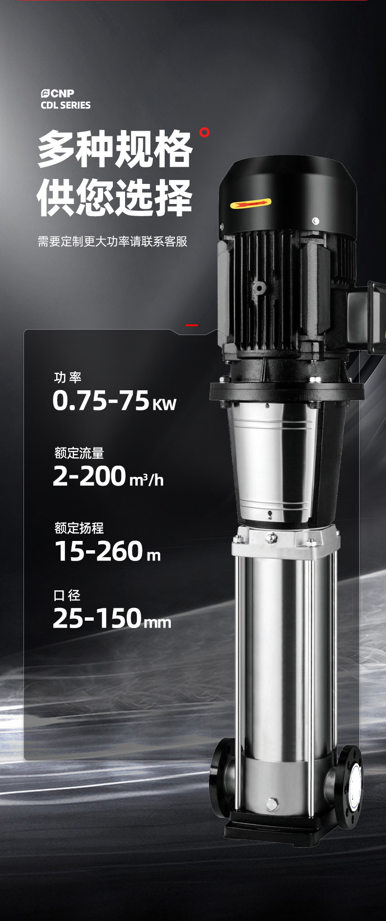 南方CDL,CDLF非自吸輕型立式多級離心泵,電機軸通過聯軸器直接與泵軸聯接,葉輪導葉采用不銹鋼板沖壓焊接或不銹鋼精密鑄造制成,泵進出水口在泵底同一直線上(可配IEC或NEMA電機)。
