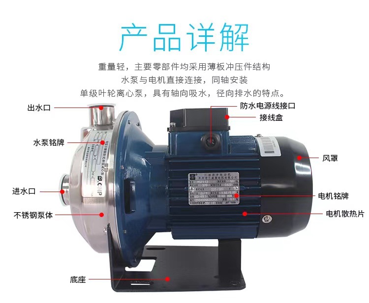南方MS,MSS非自吸不銹鋼臥式單級離心泵,主要零部件采用不銹鋼板沖壓結構,配加長軸電機,軸向入口和徑向出口。
